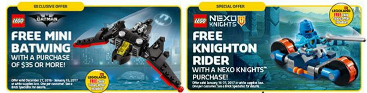 De kalender belooft in eerste instantie weinig soeps en er is dan ook weinig waar we enthousiast over kunnen worden als het gaat om gratis sets bij een bestelling. Het enige wat de Amerikanen in januari als freebie krijgen is een LEGO Batman Movie Mini Batwing Polybag en een LEGO Nexo Knights Knighton Rider Polybag. Het is niet veel, maar wie het kleine niet eert…