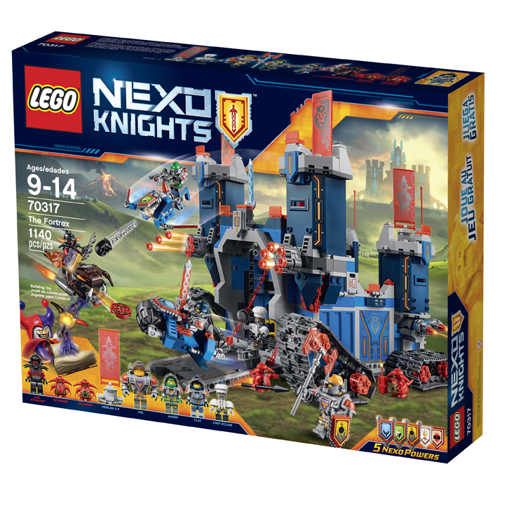 \”The Fortrex is a huge two-in-one rolling castle with more than 1100 pieces. Kids can launch the Knight Cycle and Aero-Striker V1 to engage the Ash Attacker and Scurriers! Fold out the walls to reveal the hi-tech HQ and get your brief from Merlok 2.0, and plan your next daring mission at the round table to stop Jestro taking the Book of Evil! The set includes five scannable shields for NEXO Powers: Ground Power, Super Human Speed, Hawk Holler, Chicken Power and Charging Attack.\”