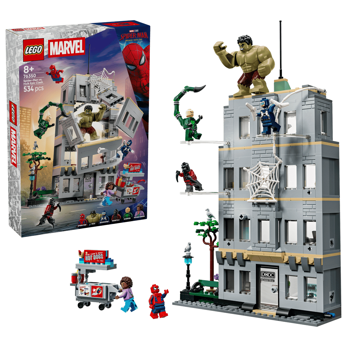 Slinger de actie uit Spider-Man: Brand New Day tegemoet met deze Spider-Man vs. Hulk ultieme confrontatie (76350) bouwset, een geweldig cadeau voor jongens en meisjes vanaf 8 jaar. Kinderen kunnen eindeloze explosieve avonturen beleven met verschillende LEGO Marvel personages, waaronder minifiguren van Spider-Man, Tarantula, Scorpion, Boomerang en een hotdogverkoper, plus een grote Hulk figuur. Transparante staven kunnen aan de muren van het kantoorgebouw worden bevestigd voor actie in de lucht. Door op een hendel aan de achterkant te drukken, wordt de muur aan de voorkant weggeblazen en verschijnt de machtige Hulk. Kinderen bouwen de muur vervolgens opnieuw voor nieuwe avonturen. Kleinere modellen en accessoires voor fantasierijke rollenspellen omvatten het web van Spider-Man, meubels, bouwgereedschap, een ontvangstruimte, een parkgedeelte en een hotdogkraampje dat kan worden geopend om worstjes en broodjes te onthullen.