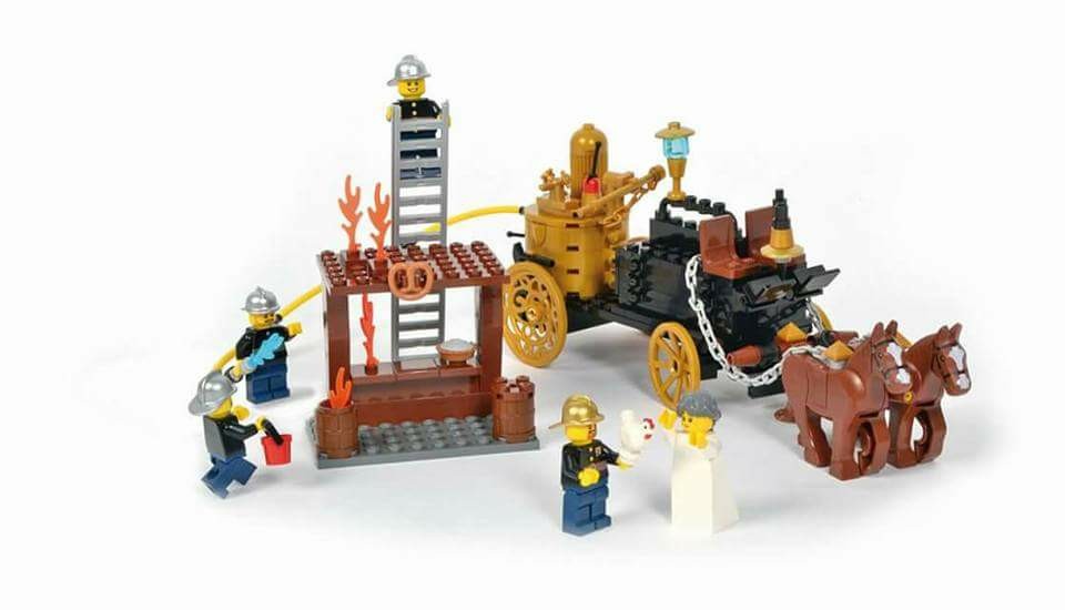 De set bestaat uit een twee paarden en bluswagen, en een kraampje. Op de wagen is plek voor een aantal brandweerlieden om te zitten. Achter op de wagen staat de stoomketel die gebruikt kan worden om een brandje te blussen. De kar is ook voorzien van een ladder. Tevens bevat de set een klein en eenvoudig kraampje waarin een brand is uitgebroken. Aan het Brandweerkorps om de brand te blussen en de Jonkvrouw in Nood te redden.