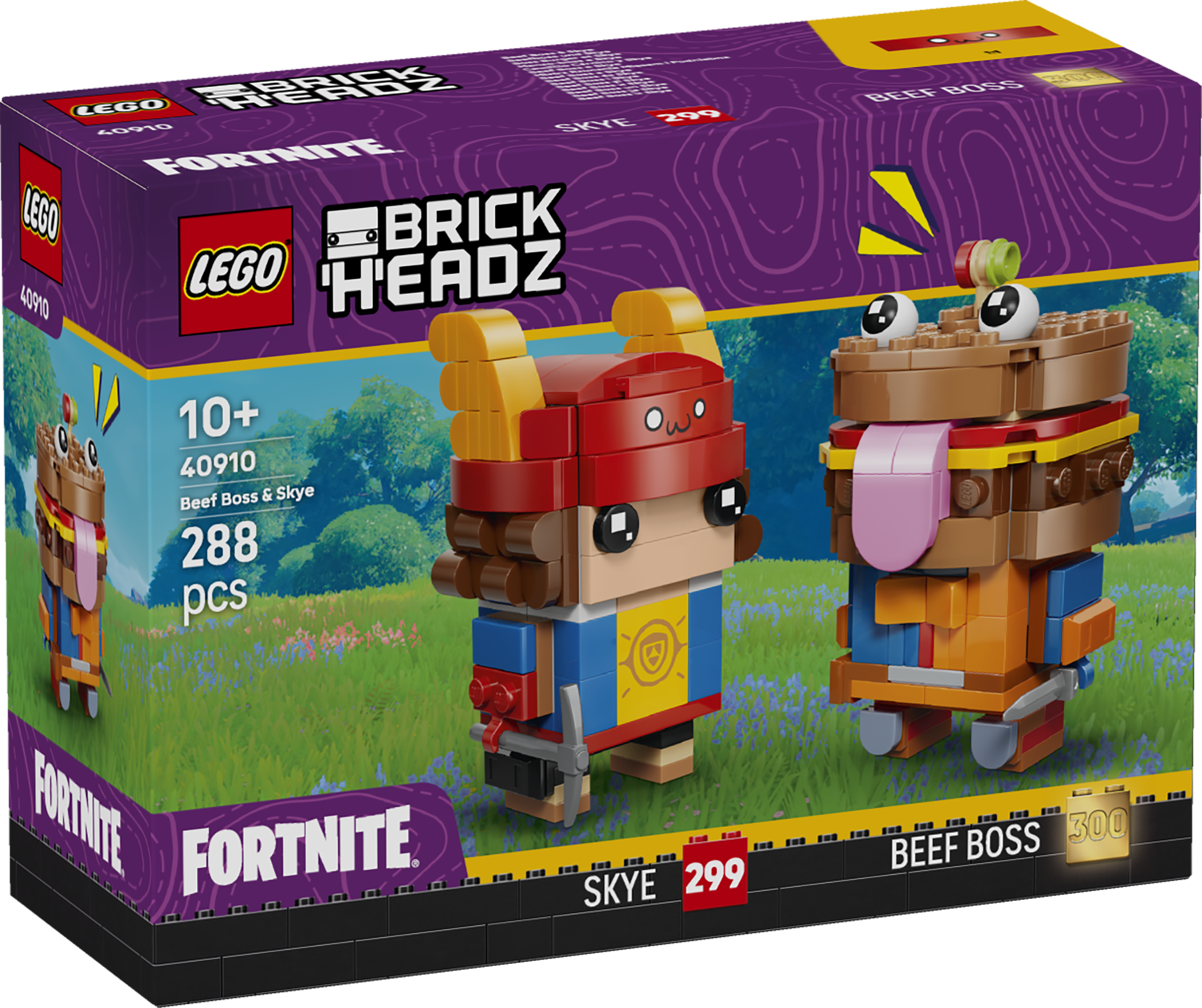 De LEGO Fortnite BrickHeadz 40910 Beef Boss & Skye bestaat uit een bouwbare Beef Boss (300e BrickHeadz-karakter) met zijn iconische hamburgergezicht en een zwaard als accessoire, en Skye die een blauw jasje draagt met een pikhouweel als accessoire.
