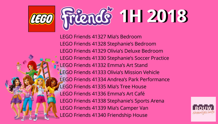 De eerste lichting van 2018 zal bestaan uit 12 LEGO Friends sets. De sets zijn verdeeld over diverse subthema\’s. De dozen van de sets hebben een update gekregen en de karakters op de dozen zijn in plaats van meisjes nu wat volwassener. We kunnen een groot gedeelte van de sets (gedeeltelijk) beschrijven. Je kan ze onder de onderstaande afbeelding vinden. Let er wel op dat we de sets omschrijven van gelekte afbeeldingen en dat LEGO nog het één en ander aan kan passen aan het uiteindelijke ontwerp.