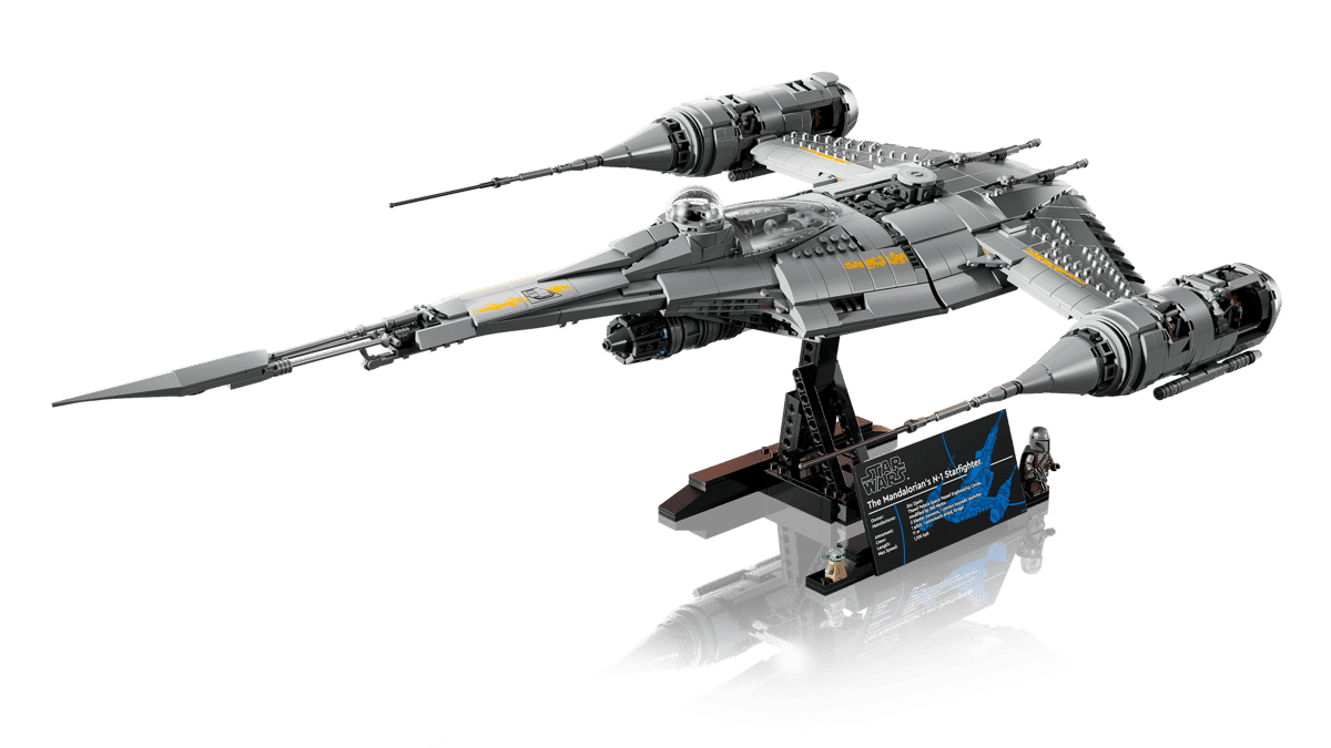 Uiteraard is de set voorzien van de bekende displaystandaard en plaque met info over het “echte” model. De standaard maakt het mogelijk om de N-1 Starfighter in twee dynamische oriëntaties te displayen: opzij of van voren. Verder zijn een Mandalorian met een blasterpistool en een Grogu minifigures toegevoegd.