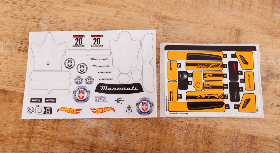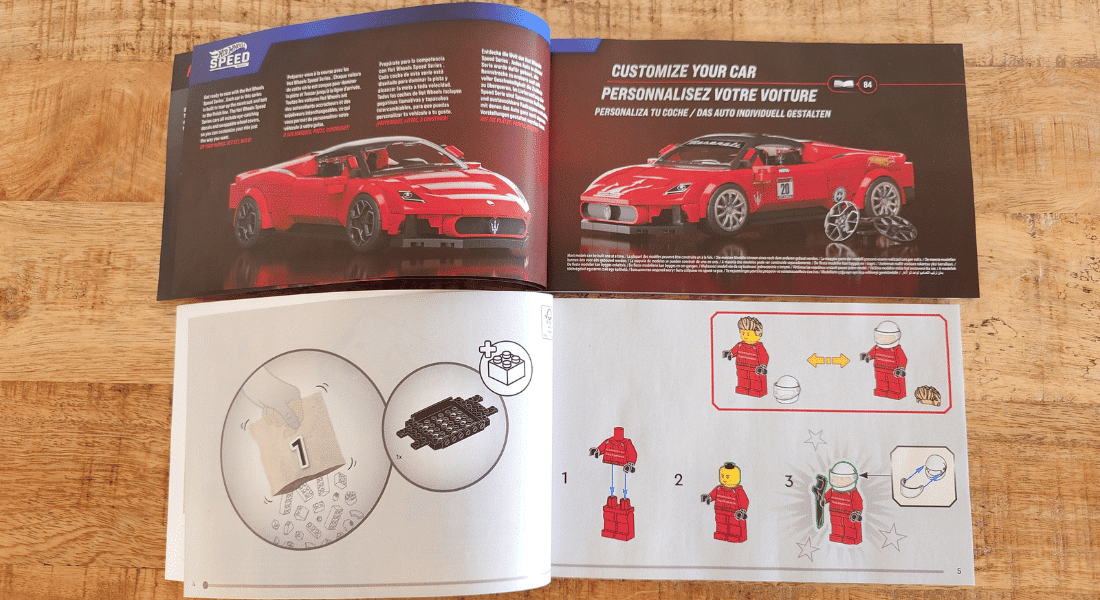 Ook het aantal onderdelen en extra’s varieert. De LEGO Porsche bestaat uit 348 onderdelen en wordt geleverd met een minifiguur, helm, haarelement, vier extra wieldoppen en een moersleutel. De Maserati bevat 250 onderdelen en biedt als extra’s een metalen bodemplaat, vier extra wieldoppen en een 1:64 Hot Wheels Maserati MC20.
