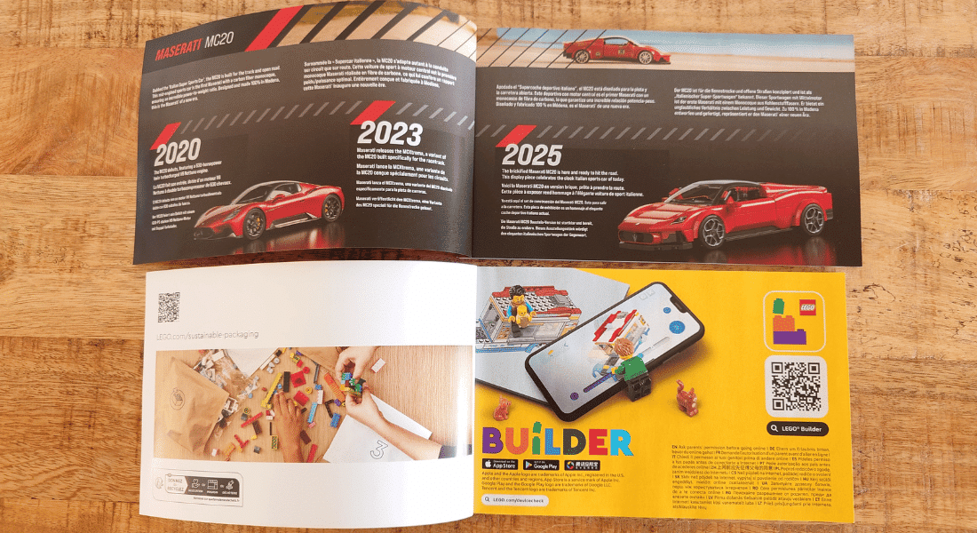 Ook de verpakking en instructies ademen premiumkwaliteit. De doos is gemaakt van dik karton en voorzien van een lipje, zodat je hem eenvoudig kunt hersluiten. Binnenin vind je meerdere zakjes met onderdelen, de instructies, een optioneel stickervel en een extra insert met twee soorten velgen, wielen, de metalen bodemplaat en het die-cast model van de Maserati MC20. De handleiding bevat niet alleen duidelijke bouwinstructies en een onderdelenlijst, maar ook extra pagina’s met informatie over het voertuig en een voorwoord van de designers, wat zorgt voor een luxe en informatieve ervaring.