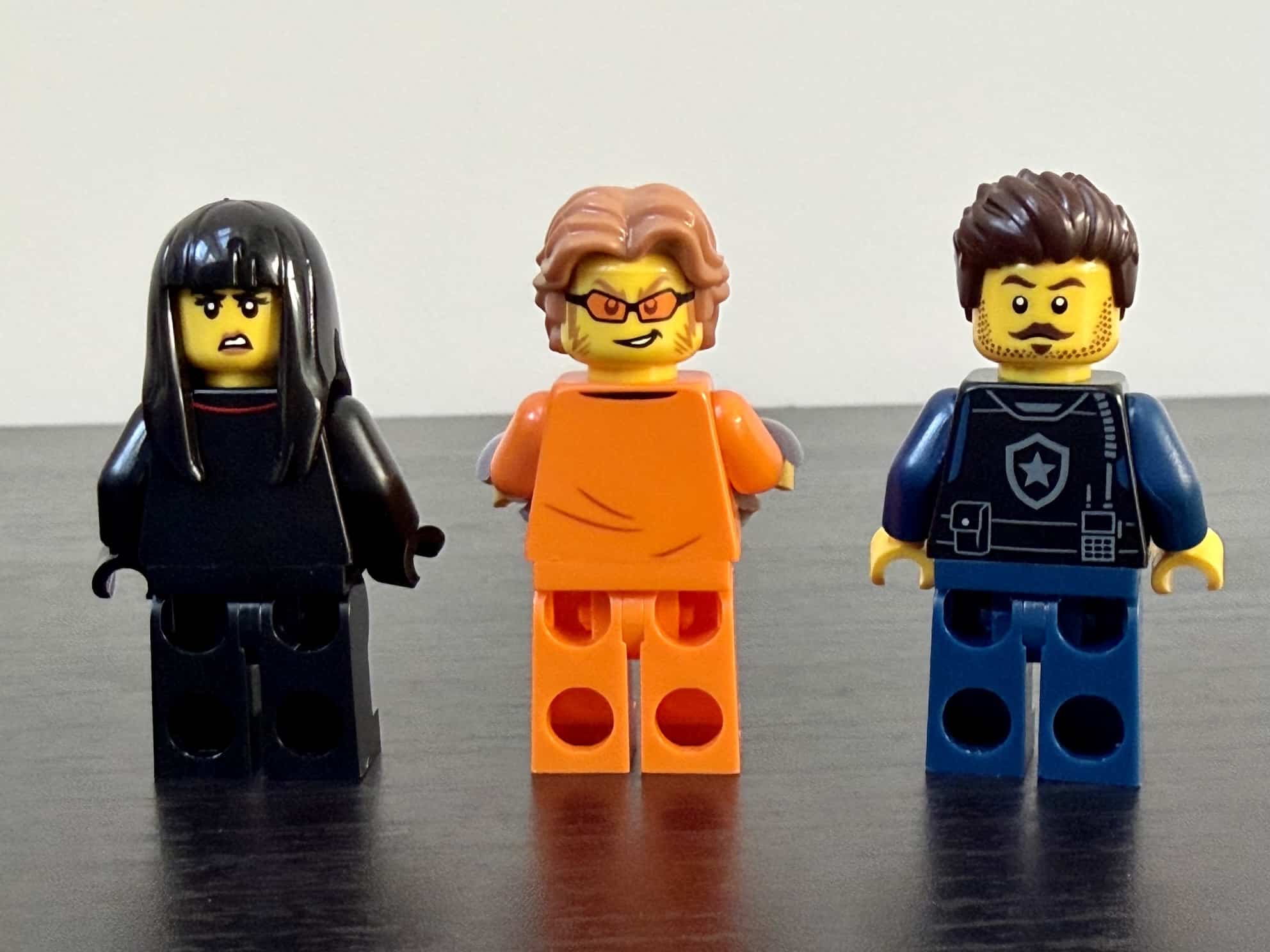 De handlanger van de man in de oranje overall draagt een zwart pak met een opvallende stropdas. Zou ze lid zijn van een criminele organisatie? Haar foto staat immers op een bedrukte 2×3 Tile die we in andere varianten in eerdere LEGO City-sets zagen. De variatie aan minifigures is goed al is het jammer dat geen van hen prints op de benen heeft.