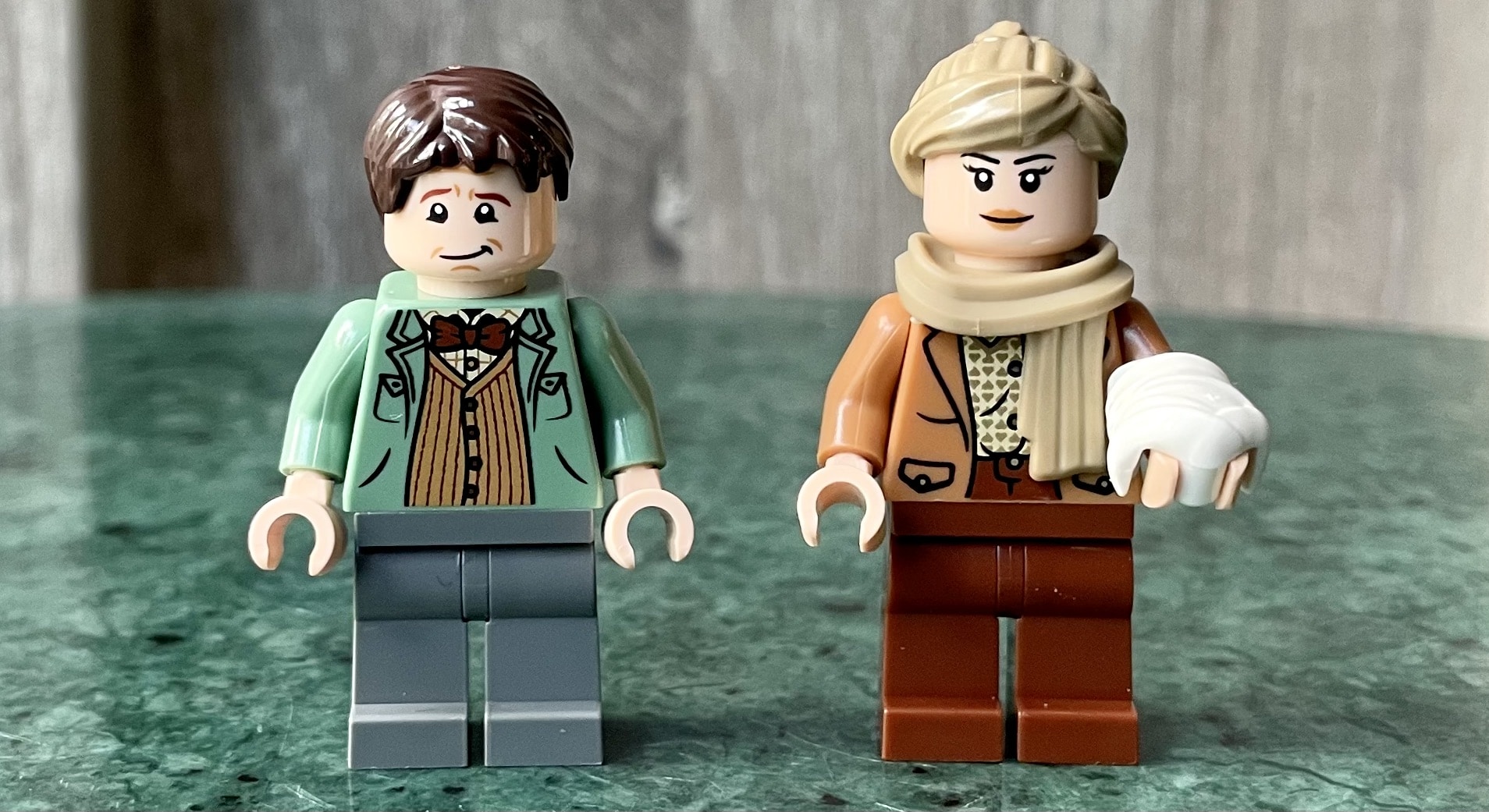 De LEGO The Walshes’ Attic GWP wordt geleverd met twee Minifigures, te weten Irving en Irene Walsh. De torso’s van beide Minifigures zijn al een keer eerder gebruikt bij Minifigures van Harry Potter. Het hoofd van Irving Walsh zagen we vorig jaar al langs komen bij Minifigure van Chief Martin Brody in de LEGO Ideas 21350 Jaws set. Desalniettemin zijn beide Minifigures mooi vormgegeven, bevatten de torso’s diverse details en heeft Irene, net als in de film, haar arm in het gips. Om het plaatje compleet met maken draag ze een sjaal om haar nek.