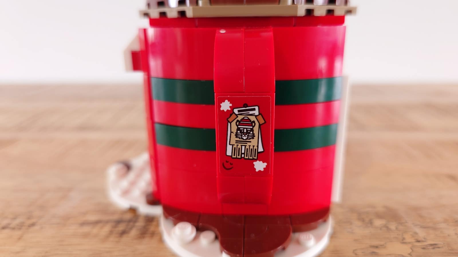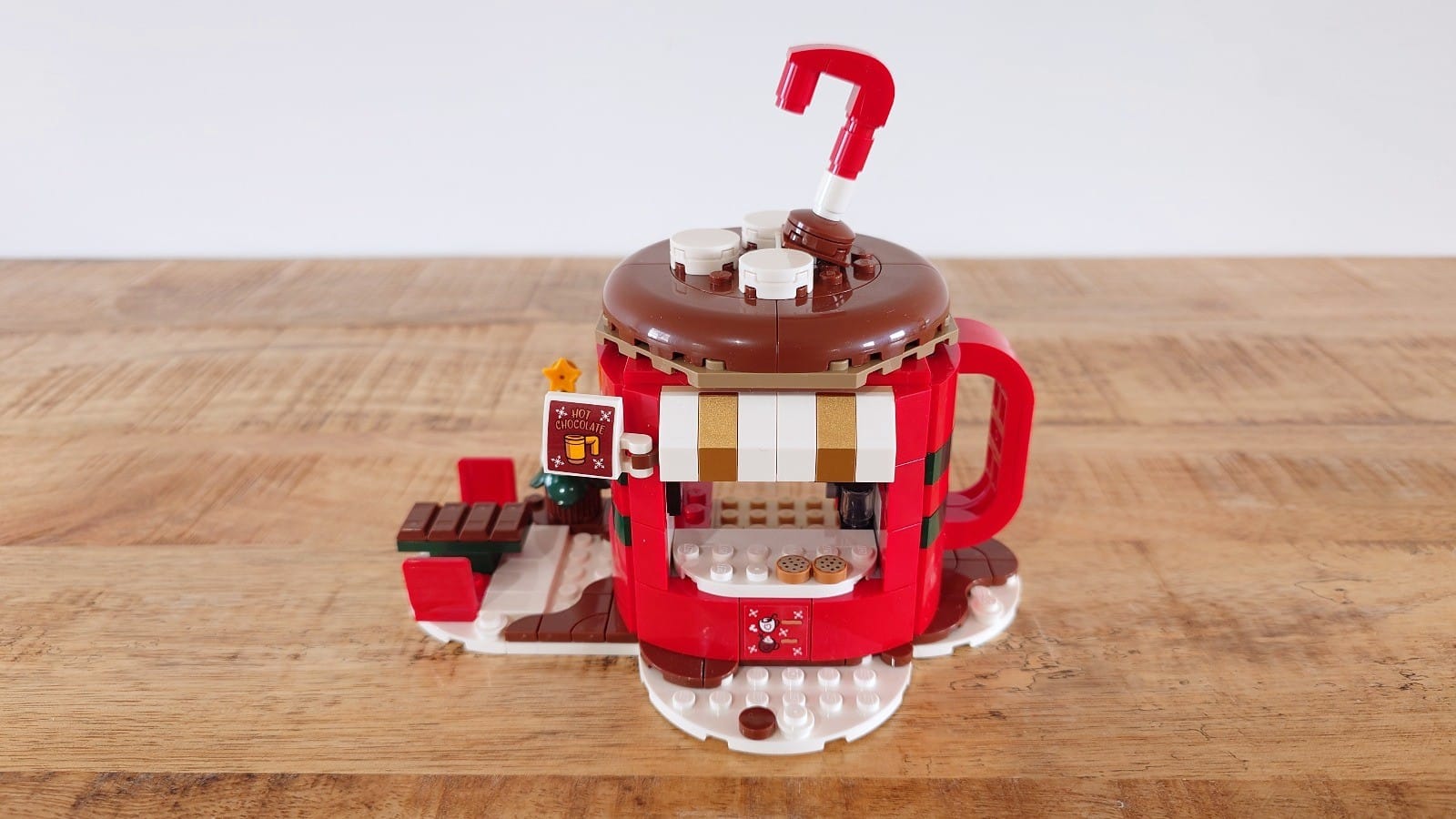 Naast de kraam staan een besneeuwde kerstboom, twee stoelen en een tafel in de vorm van een chocoladereep. Rondom ligt sneeuw en over de mok is wat warme choco geknoeid – leuke details die extra charme toevoegen. Verder zijn er drie stickers: voor het uithangbord, de kraam en een affiche van Cataclaws (de LEGO-kerstmascotte), plus enkele sneeuwballen.