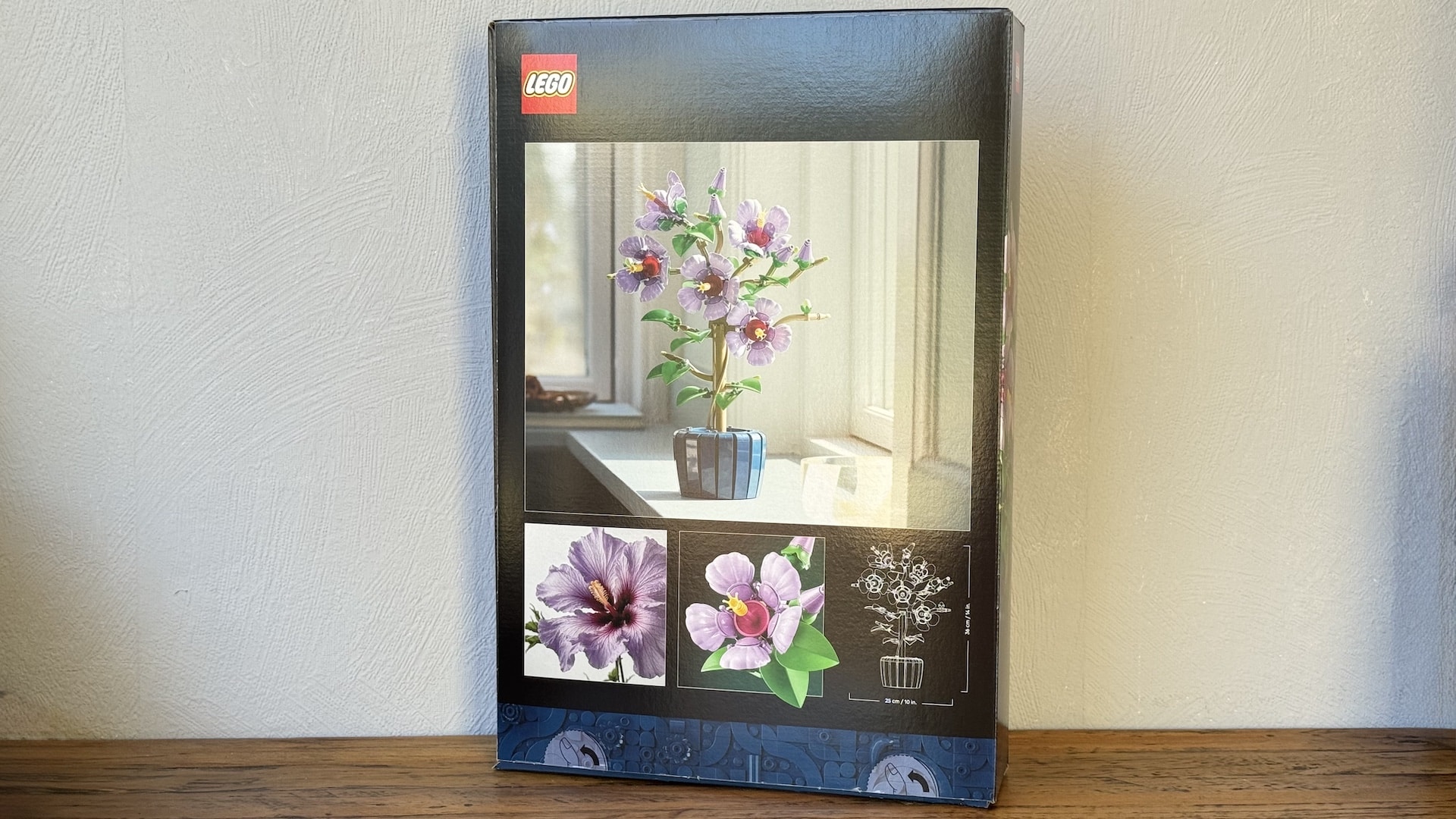 Op de doos staat de kleurrijke LEGO-plant met prachtige tinten in roze en paars afgebeeld. Op de achterkant staat een afbeelding van een echte hibiscus en zie je de afmetingen van het bouwwerk zo’n 25cm breed, 36cm hoog en 13cm diep.