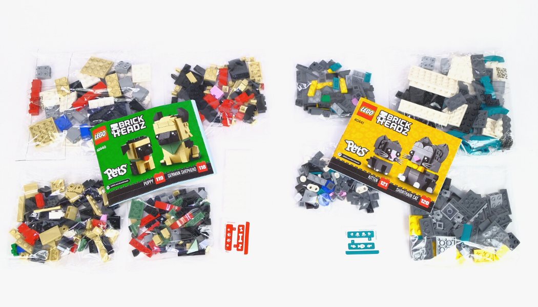 De inhoud van de doosjes is gelijk aan elkaar en bestaan uit vier ongenummerde zakjes met onderdelen, een instructieboekje en een stickervel met twee stickers. De verkoopadviesprijs van de sets bedraagt per stuk €14,99. Met 247 onderdelen (honden) en 250 onderdelen (katten), komt het gemiddelde van beide sets terecht op €0,06 per onderdeel.