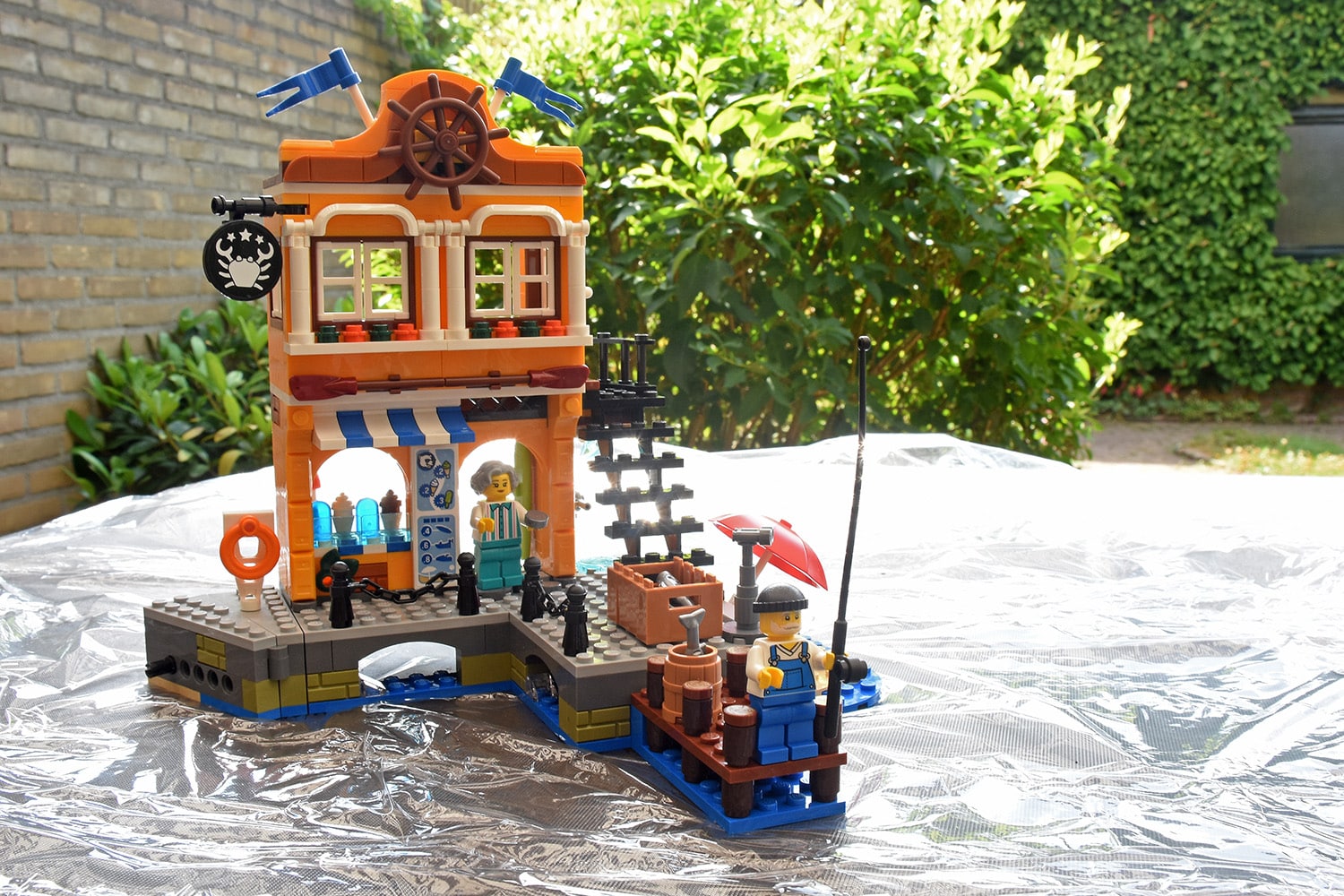 Het piertje is de beste plek om vissen te vangen voor het visrestaurant. Details hier zitten in de paaltjes van het steigertje en een ton met gevangen vis. Er is ook een krat met vissen erin, maar in de instructies staat niet goed aangegeven waar deze geplaatst dient te worden. Wellicht past de visvoorraad in het voorste ruim van de lichter.