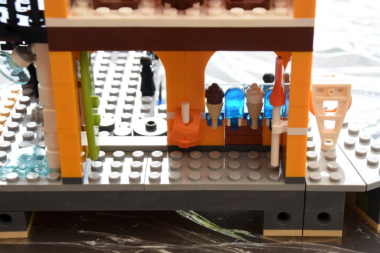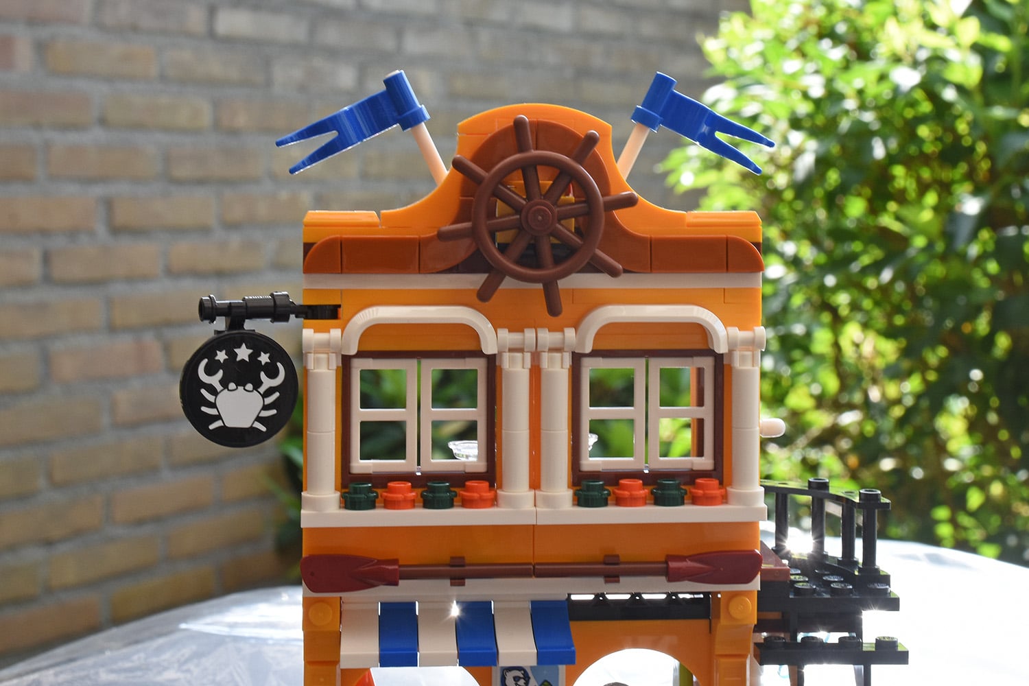 Het gebouwtje zelf is erg ondiep, zoals we gewend zijn van het LEGO City-thema. Het is toch vooral bedoeld als speelthema voor kinderen en een set met het label 8+ zal dus niet al te ver uitgewerkt zijn. Desalniettemin is de façade van het restaurantje erg fraai vormgegeven. Twee ramen met leuke pilaartjes in Ionische stijl, bloemetjes in de vensterbank, een stuurwiel aan de dakrand en ronde vormen met curved slopes en inverted arches vallen op. Op het dak waaien twee blauwe vaandels in tegenovergestelde richting. Kennelijk is de wind erg wispelturig aan de kade. De kleurkeuze is leuk met het oranje, wit en blauw en steekt lekker af ten opzicht van de kraan en de lichter.