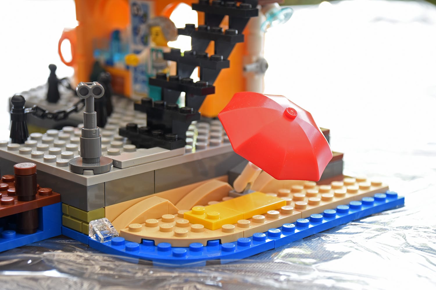 De kade aan de voorkant is ook weer versierd met zwarte paaltjes en er staat een toeristenverrekijker waarmee je naar de schepen kunt turen. Onder de trap is een buitendouche verstopt, zodat je het zand van het minuscule strandje niet mee naar binnen neemt als je gaat eten. Het zand is mooi gesculpt tegen de kade aan. Het strandje is aangekleed met een handdoek en parasol, maar wie gaat er nu zonnen in de haven? Zulke details zijn wel leuk verzonnen, echter gaan ze ten koste van details in de lichter of de kraan. Als ik zou moeten kiezen, had ik die beter uitgewerkt willen zien.