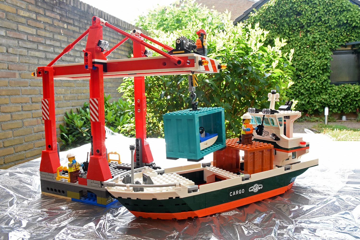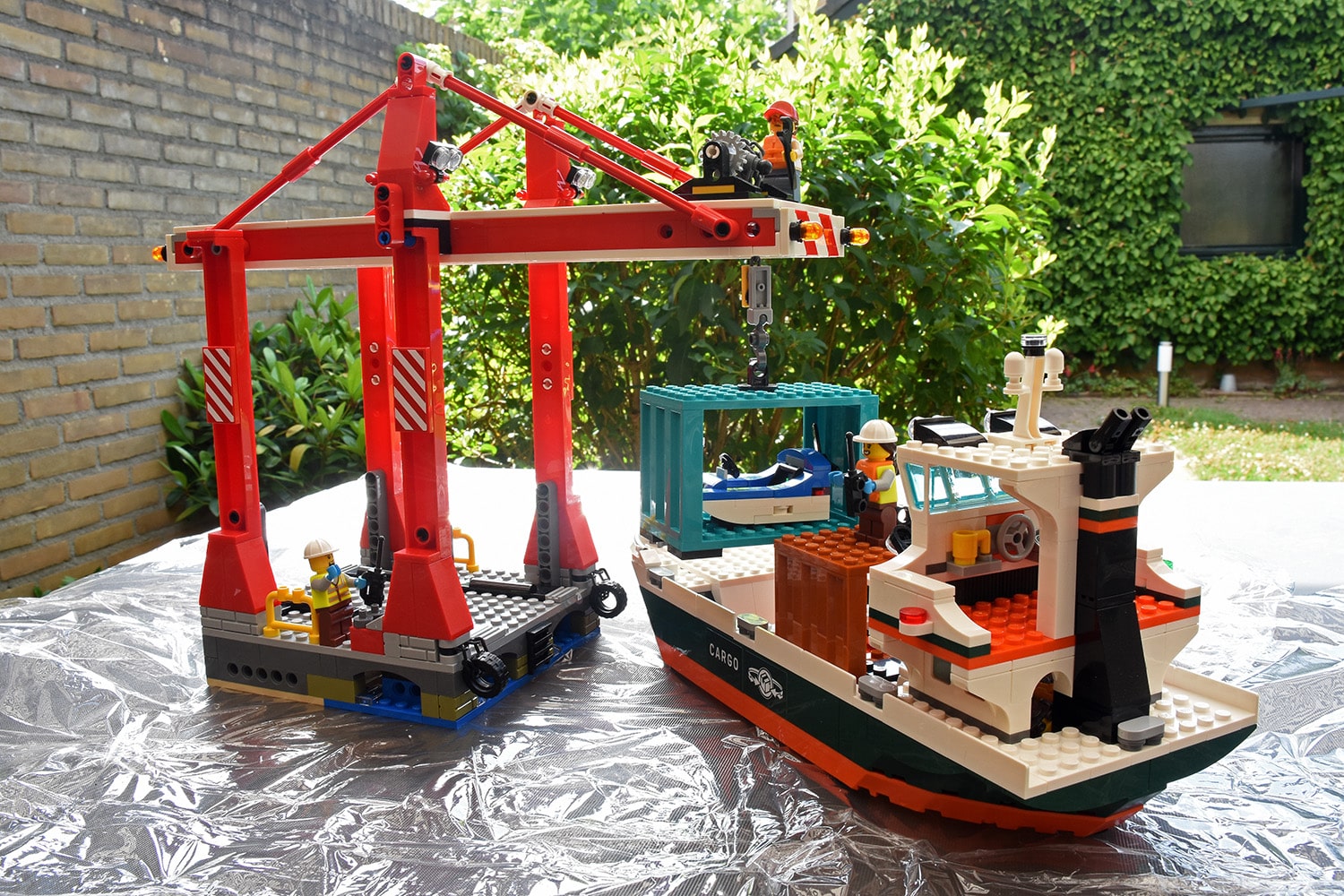 LEGO City 60422 Harbour deed me direct denken aan mijn werkveld. Ik werk zelf in de containerwereld op kantoor en boek grote orders in om containers van de Rotterdamse en Antwerpse havens naar het achterland te vervoeren. Dat gebeurt via trein en via lichter, zoals in deze LEGO-set wordt uitgedragen. Op de bargeterminal in Venlo worden de containers van het containerschip op de kade gezet en per vrachtwagen naar warehouses in de regio vervoerd. In zulke containers tref je soms ook LEGO aan.