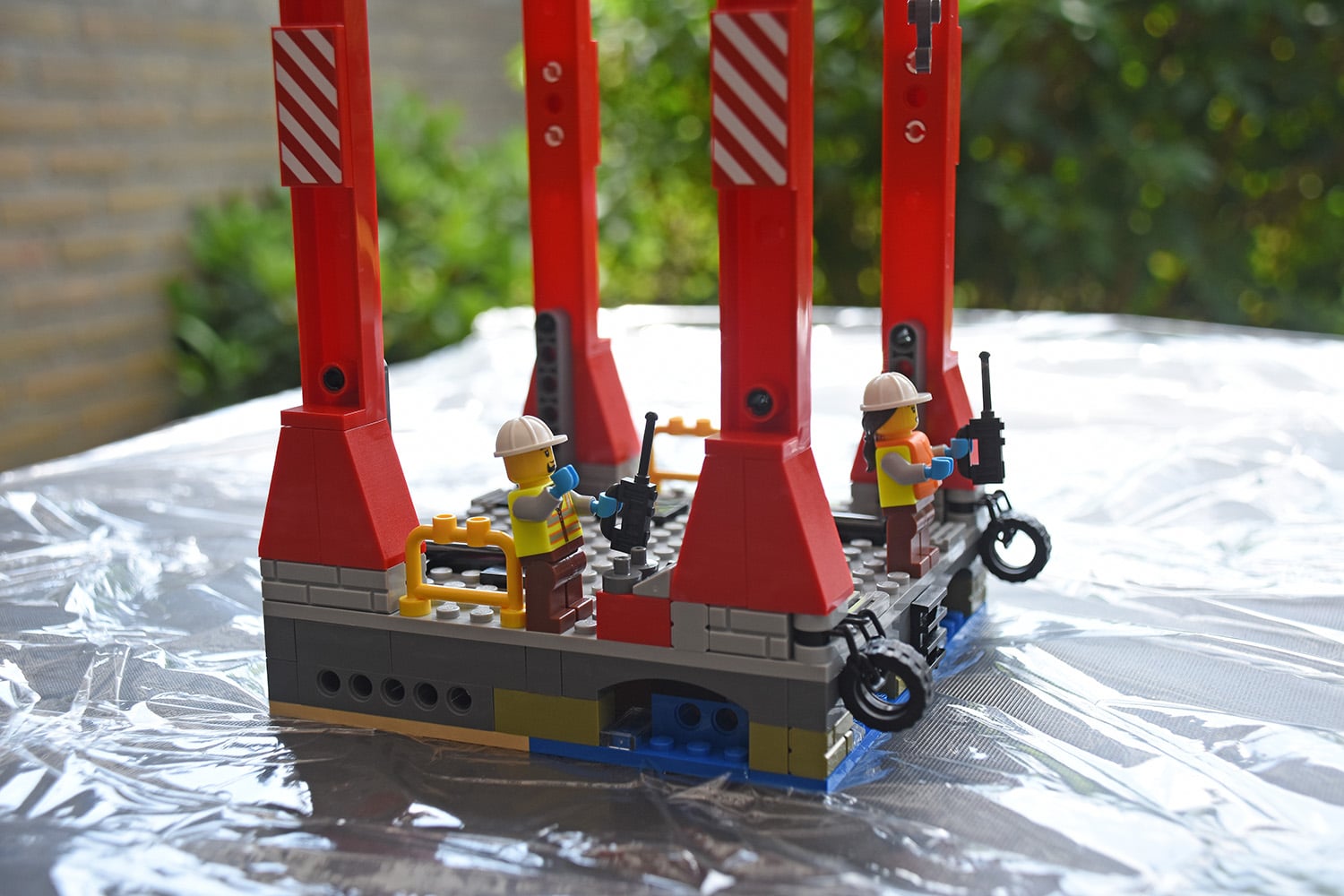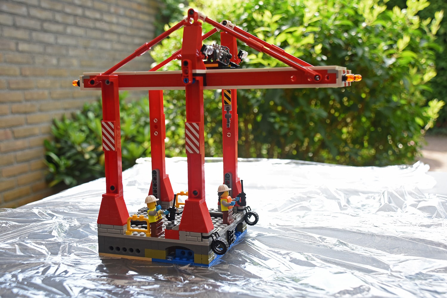 De eyecatcher van deze LEGO City 60422 Harbour is de rode containerkraan. Die kleur is goed gekozen, want hij valt direct op. Op de bargeterminal in Venlo staan inmiddels twee van zulke kranen, waarbij de bouw van de laatste pas nog is afgerond, aldus Florien. De containerkranen bestaan uit enorme constructies, die over de kade gerold kunnen worden naar de juiste positie. Een kraanoperator bedient vanuit een cabine bovenin de kraan de spreader, die de containers laadt en lost vanaf de kade.