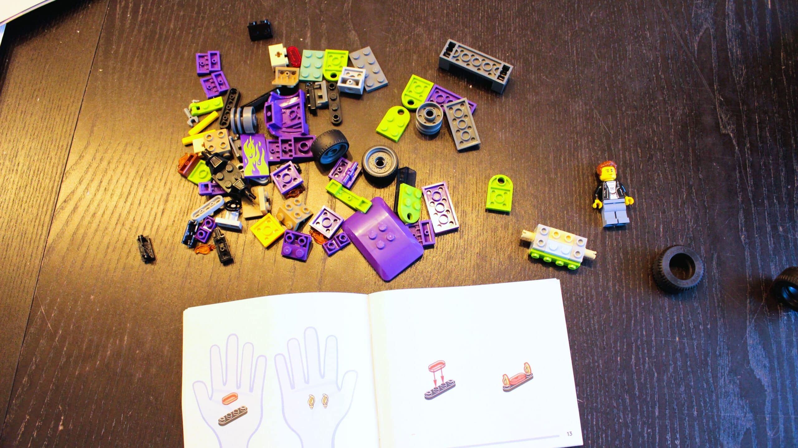 Het bouwen van de Hot Rod is natuurlijk geen bijzonderheid. Het instructieboekje daarentegen wel. Aangezien dit een 5+ set is, heeft LEGO ervoor gekozen op elke linker bladzijde kinderhanden met de steentjes voor die stap te laten zien. Dit om de schaal in te leren schatten. Voor een volwassene is dit natuurlijk helemaal niets, maar voor een kind kan het zeer prikkelend en duidelijk werken. Op zich een leuke aanpassing voor de doelgroep.