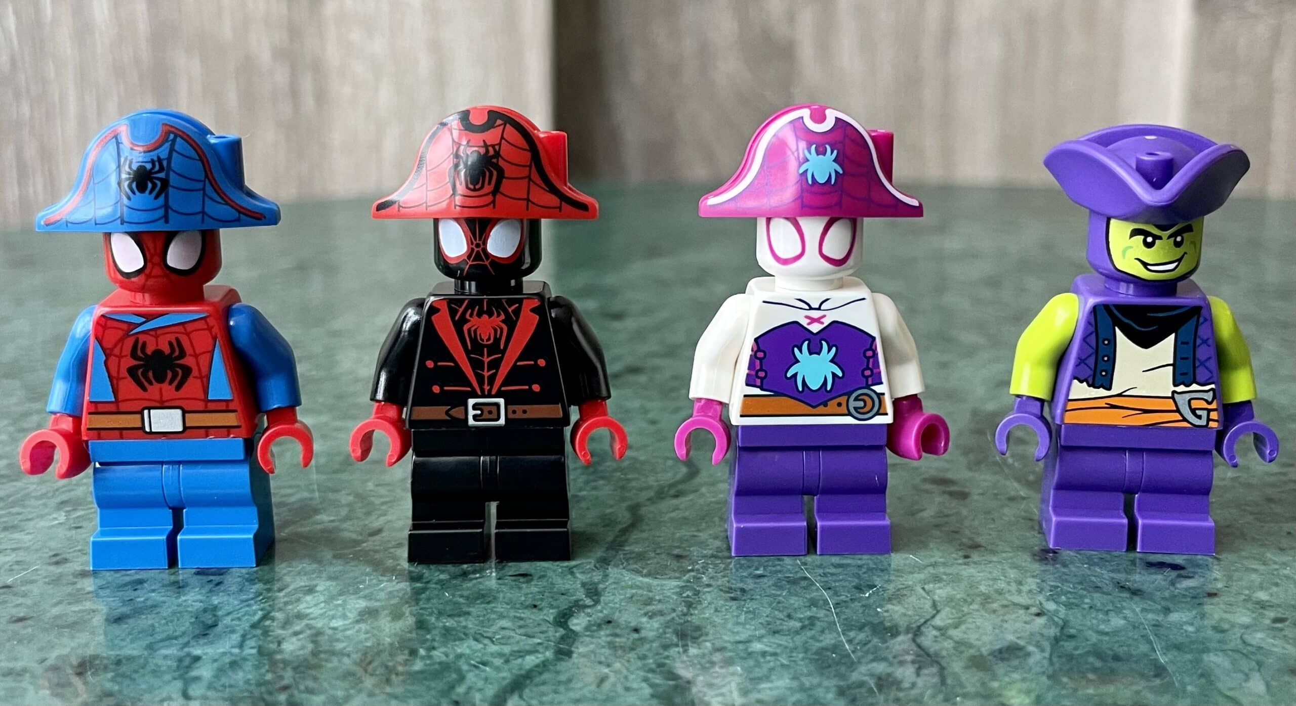 De grootste Spidey set bevat ook de meeste Minifigures, namelijk vier. Net als de andere twee Spidey sets zijn deze Minifigures uniek. De vier Minifigures zijn verkleed als piraat. Spidey, Miles ‘Spin’ Morales en Ghost-Spider dragen alle drie dezelfde piratenhoed in de kleuren die past bij hun pak. Hoewel ze alle drie een afbeelding van een spin op hun borst dragen, is het design van de spin verschillend, dit geldt ook voor de riem die ze dragen.