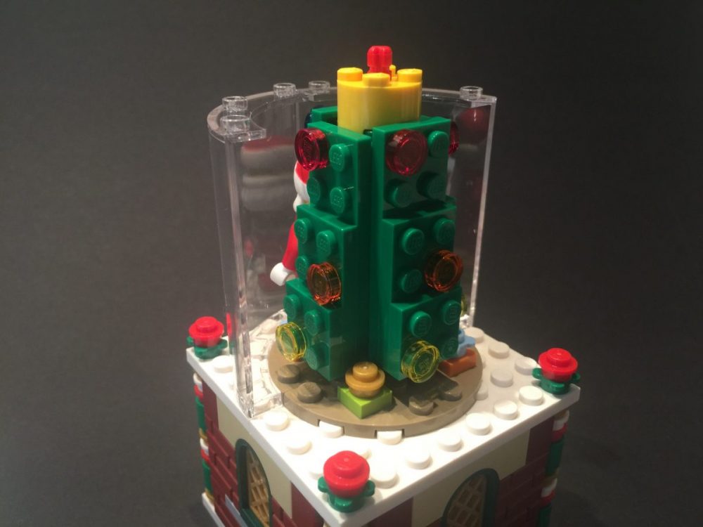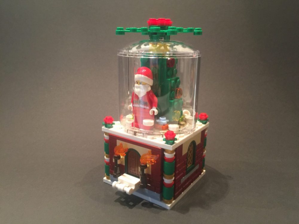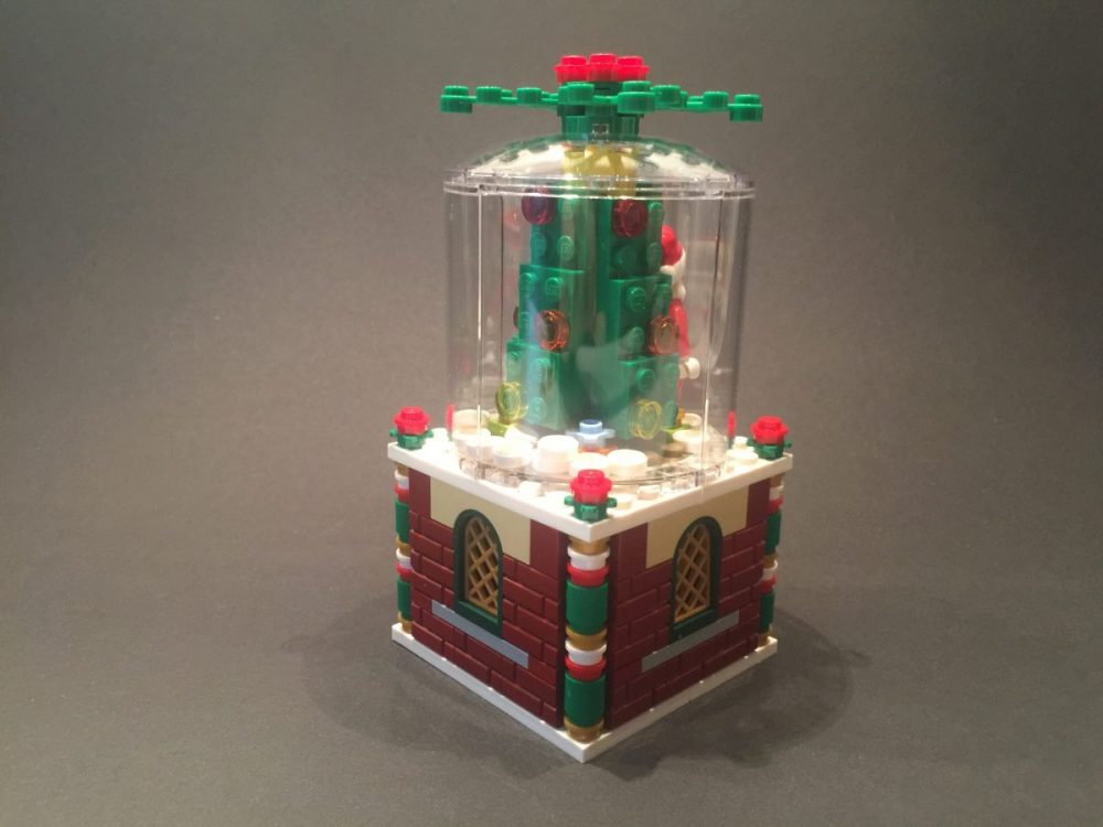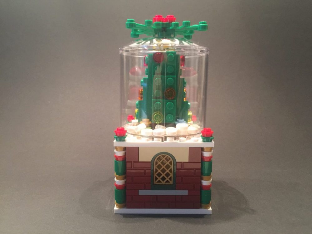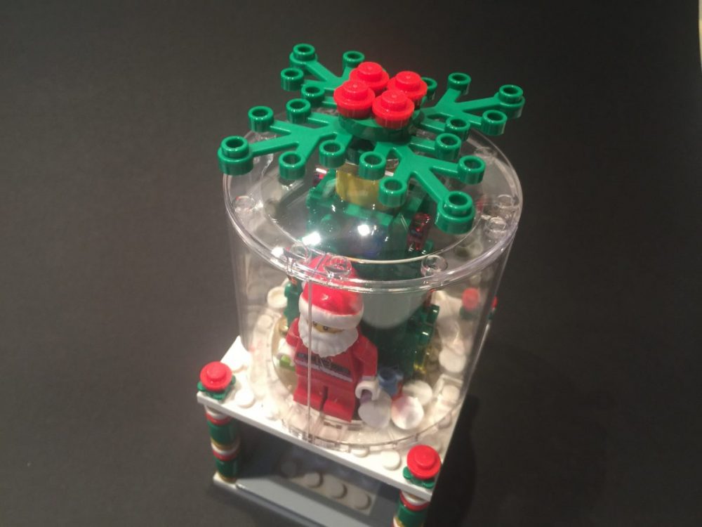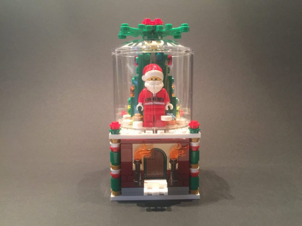 Dan is het nu tijd voor het echte werk. We beginnen met de onderkant van de Snowglobe. Niet heel spannend om te bouwen maar het kleurgebruik is prima en mocht je niets aan een Snowglobe hebben, kan je altijd de steentjes goed gebruiken. De onderkant voorzien we van een dak en plaatsen daar de kerstman op, in combinatie met wat decoratie. In het midden van de Snowglobe, bouwen we een versierde kerstboom. Vervolgens bouwen we de globe verder af en gooien we 14 losse 1×1 ronde tiles in de globe wat uiteraard sneeuw voor moet stellen. We sluiten de globe af met een doorzichtige ronde deksel die we afwerken met wat kersttakken.