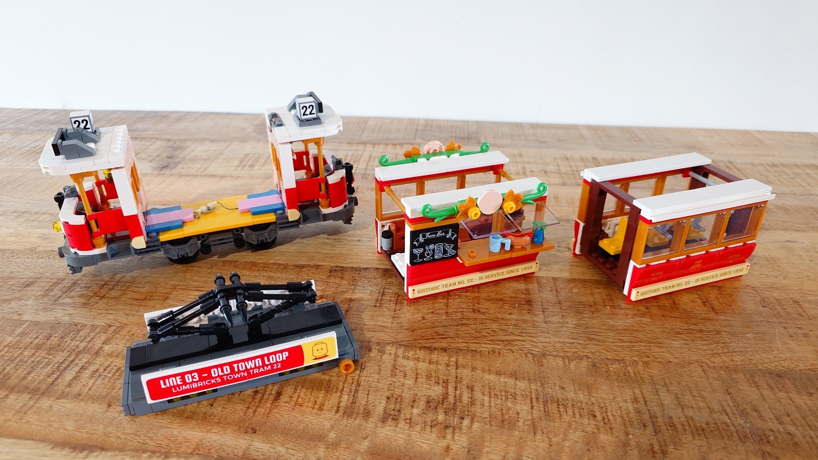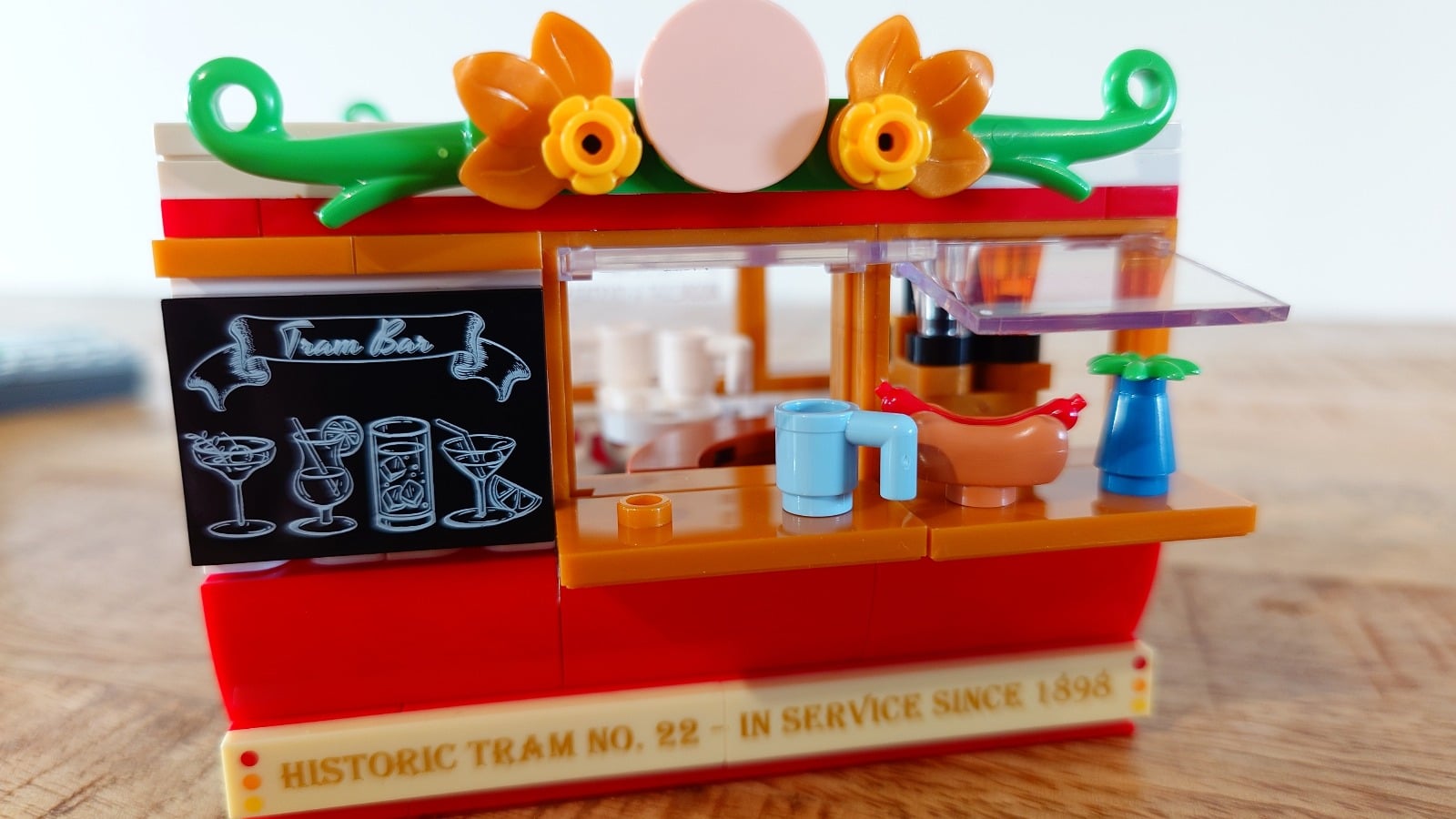 Daarna bouw je de passagierscoupe en de tram-bar. Hoewel beide coupes op het eerste gezicht repetitief lijken, zorgt het verschil in functie voor variatie. De ene coupe is ingericht voor passagiers, de andere als bar, wat zorgt voor een ander interieur en een afwisselende bouw. Ook qua details zijn er verschillen: de passagierstram heeft goudkleurige prints, terwijl de tram-bar een uithangbord, versiering en een toonbank bevat.