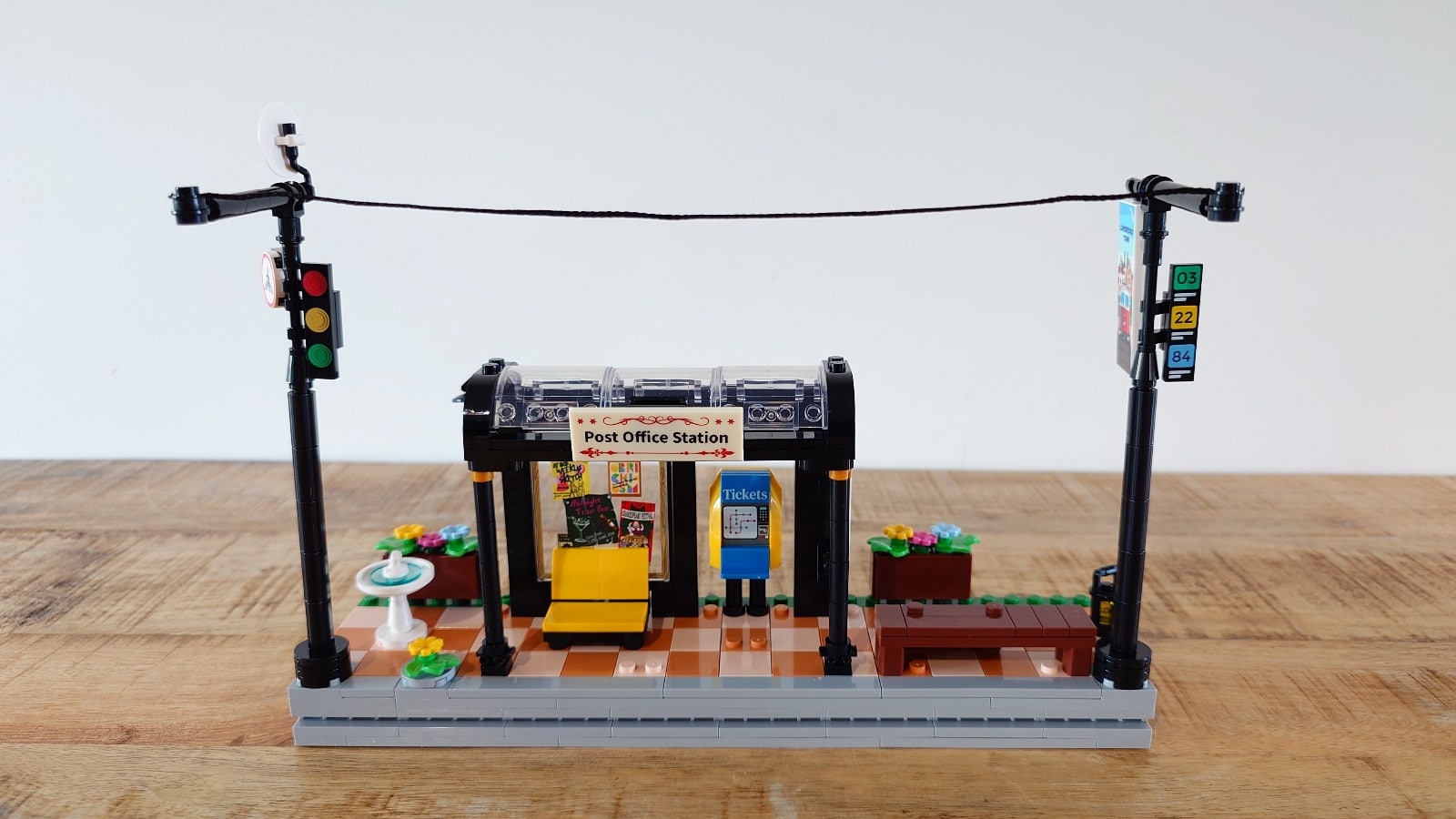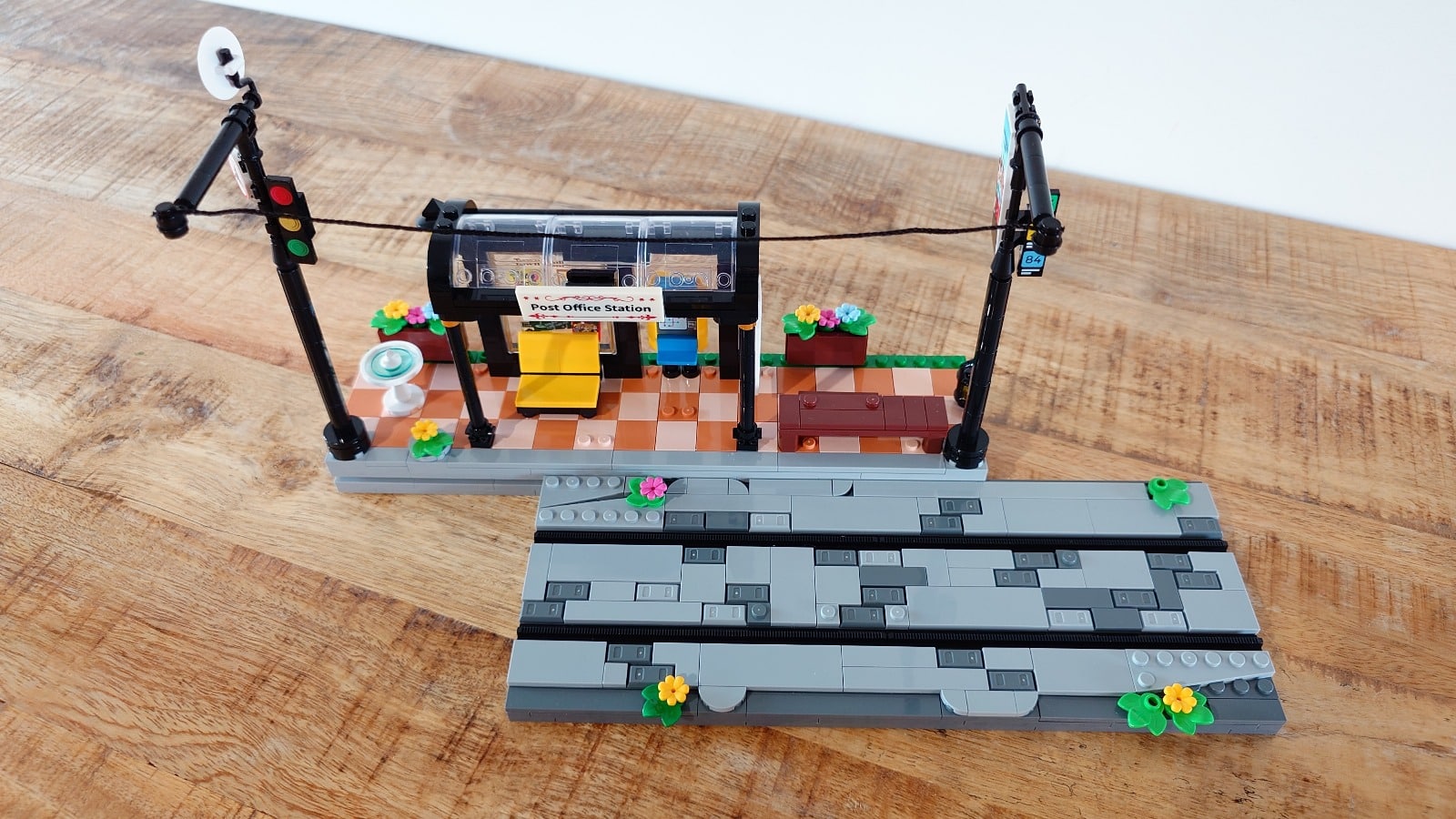 Het perron en de halte bouw je verhoogd en voorzien van een verlichte halte, een bankje, ticketautomaat, fontein, twee geleiders met verkeersborden, een verkeerslicht en een bloemenkar. Al vroeg in de bouw verwerk je de eerste verlichtingscomponenten die de halte verlichten. De batterijhouder (2x CR2032) is netjes onder de halte weggewerkt. Optioneel kun je ook de meegeleverde USB-aansluiting gebruiken om de halte via een powerbank van stroom te voorzien. Verder heeft het perron een gleuf waarin je het spoor kunt schuiven.