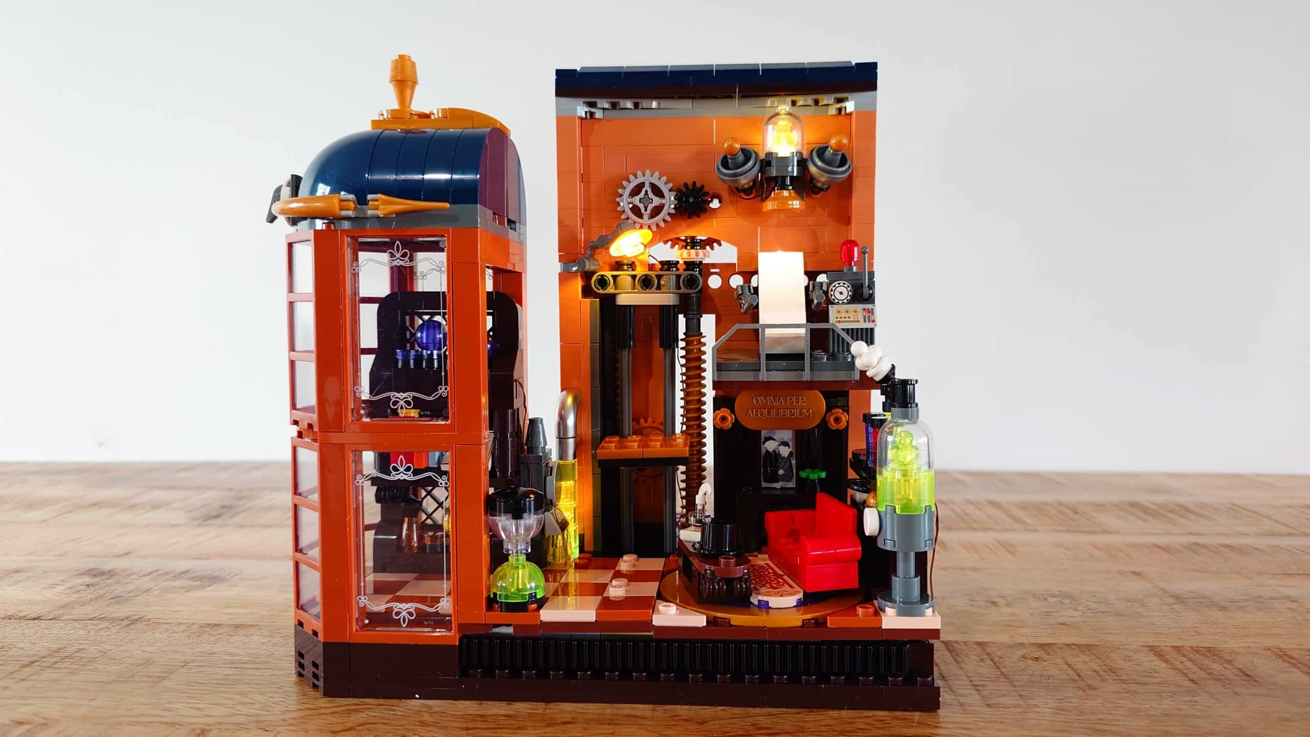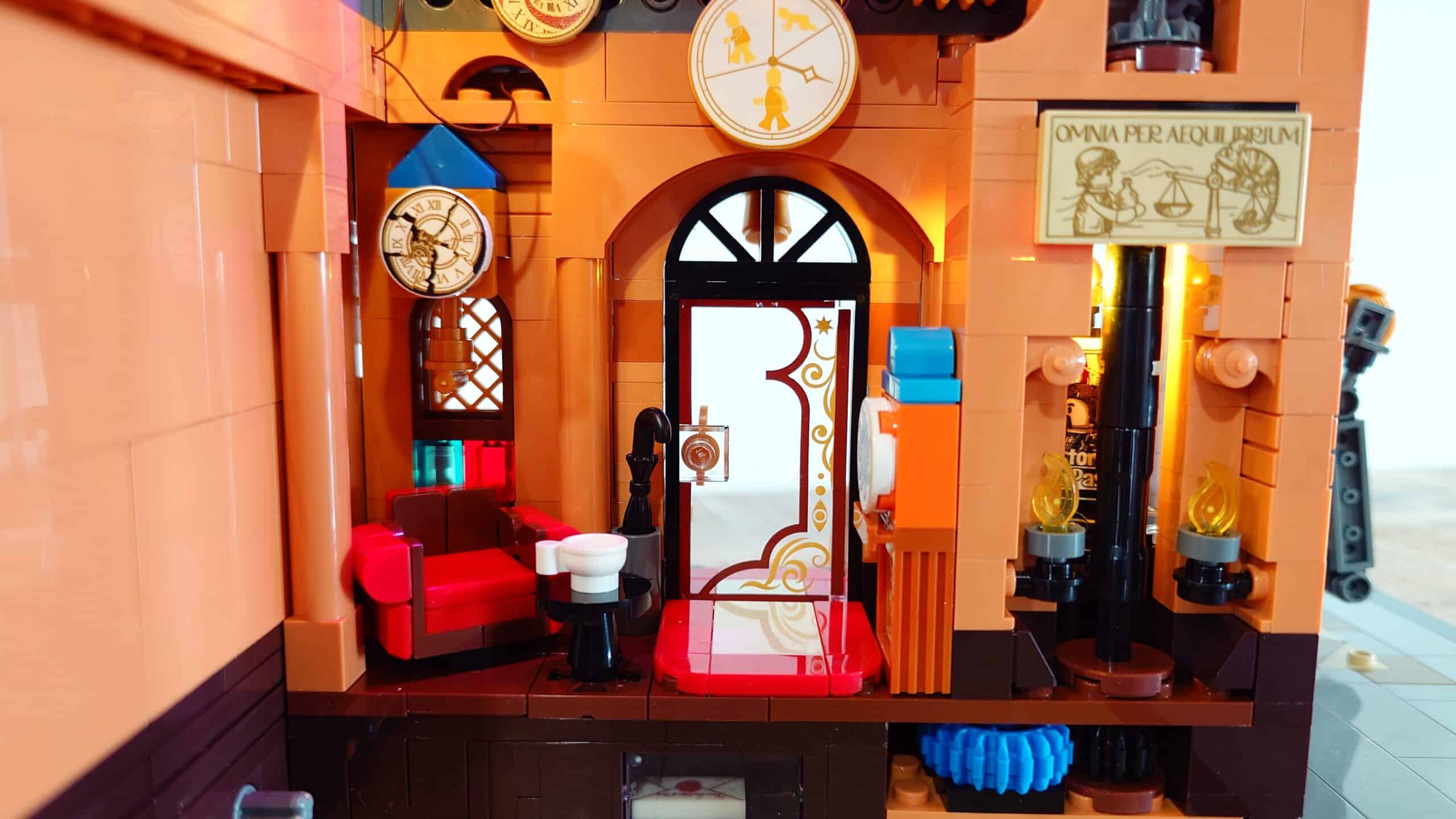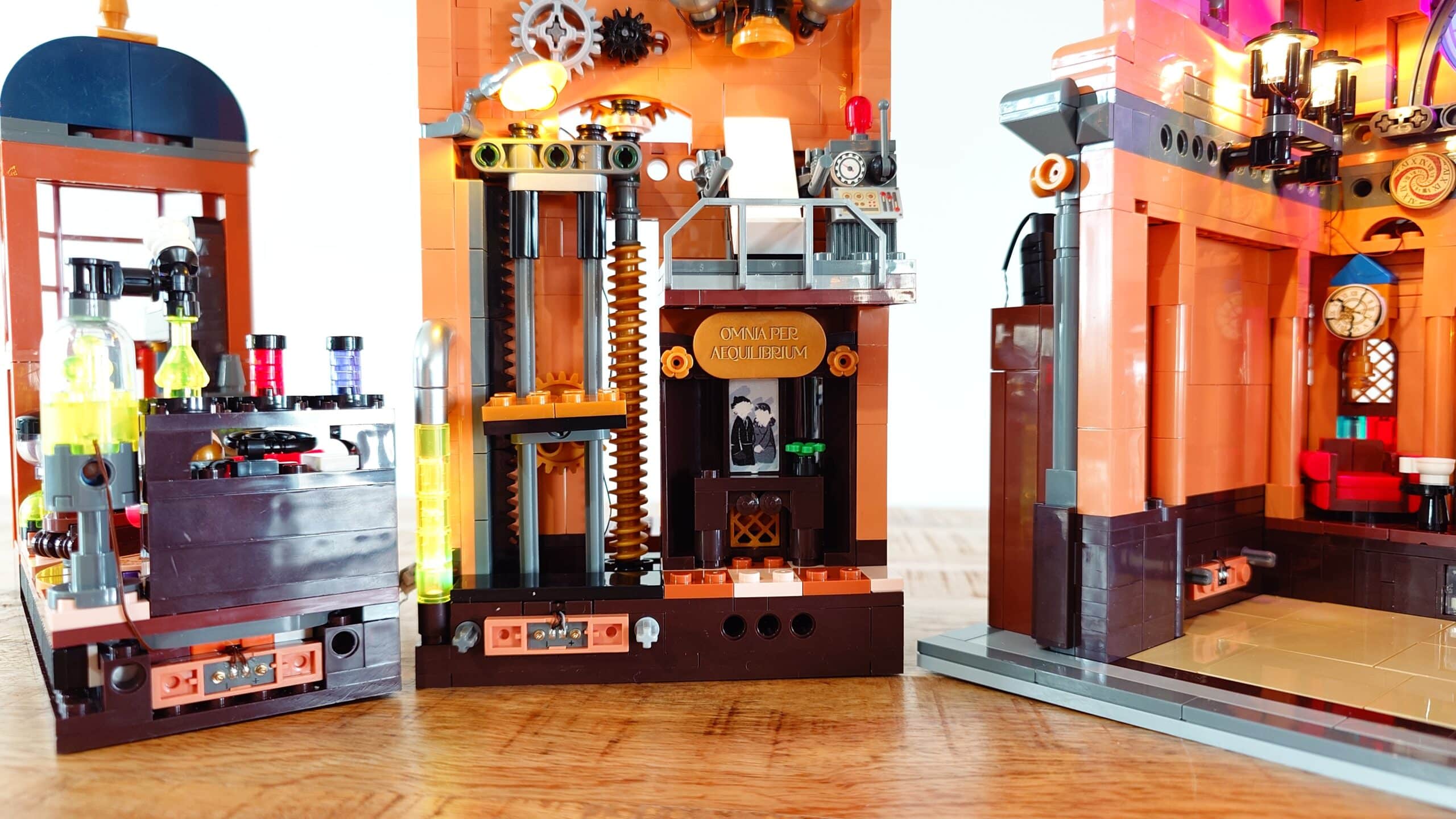 Hoewel ik geen groot liefhebber van steampunk ben, ben ik onder de indruk van wat deze set te bieden heeft. Niet alleen op bouwtechnisch vlak maakt hij indruk, ook de bijzondere contrapties verrassen. Je werkt met mechanische elementen, legt een buizensysteem aan en zelfs een werkende lift, waardoor alles lijkt samen te hangen, en deels is dat ook zo. De uitschuifbare transactiekamer drijft via een intern tandwielmechanisme de magische klok in de gevel aan. Schuif je de kamer in of uit, dan draait de wijzer van de klok mee. Een slim bedacht systeem dat bijdraagt aan de beleving.