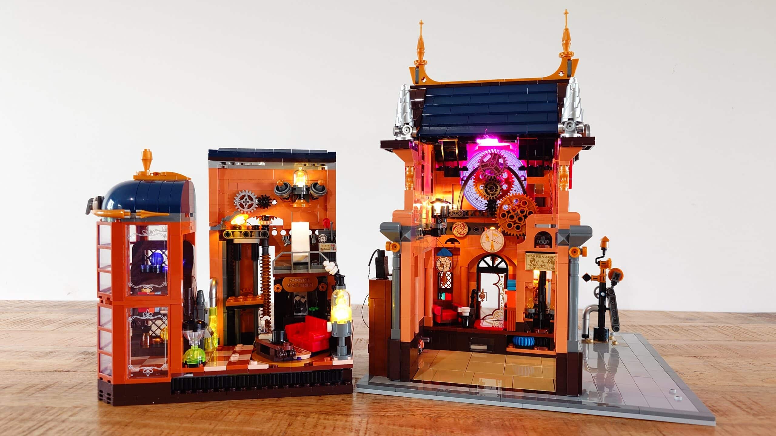 De bouw van de Lumibricks Steampunk Memory Magic Shop verloopt grofweg in drie stappen. Eerst bouw je de basisplaat met daarop de magic shop, gevolgd door een uitschuifbare transactiekamer en tenslotte een uitneembare kamer met lift en geheugenextractiekamer. De drie modules zijn verbonden via twee contactsteentjes, waardoor ze allemaal van stroom worden voorzien zonder storende kabels. Dit verhoogt de speelbaarheid en maakt het mogelijk om het interieur na de bouw goed te bekijken. Ontkoppel je de modules, dan blijft alleen het hoofdgebouw verlicht, maar dankzij een extra USB-connector kun je de losse modules apart aansluiten.