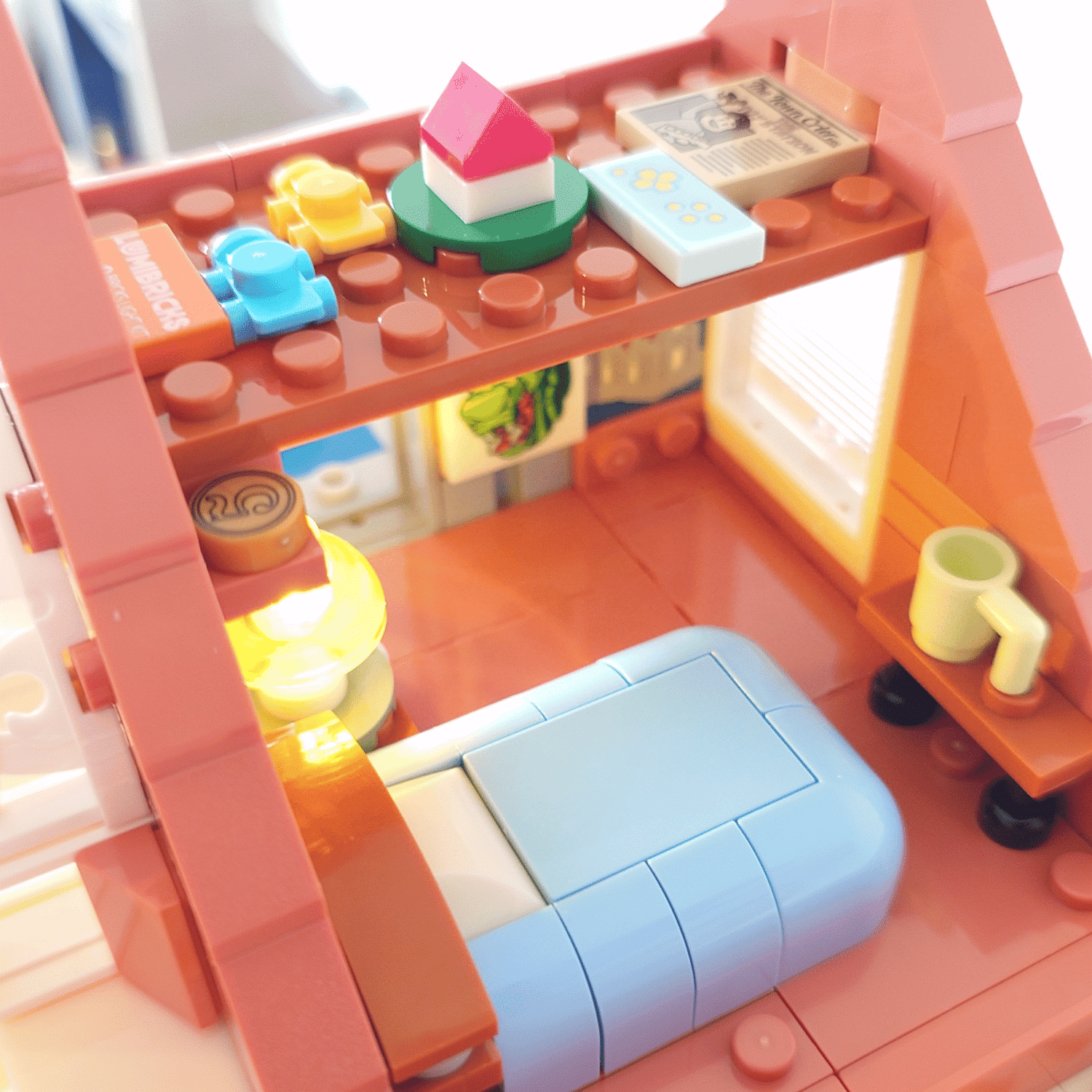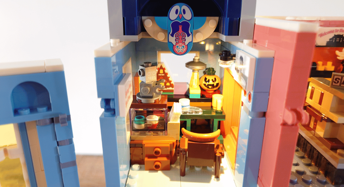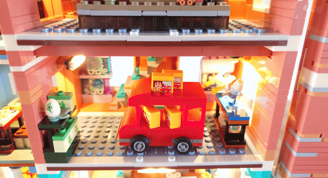 Daarna bouw je afwisselend aan de drie etages van de winkel, gevolgd door een interieurmodule. De bouw wisselt steeds tussen het blauwe en zalmroze gedeelte van de winkel, wat zorgt voor variatie. In elke verdieping worden lampjes, draadjes en connectoren geïntegreerd. Dankzij deze connectoren blijft het gebouw volledig modulair.