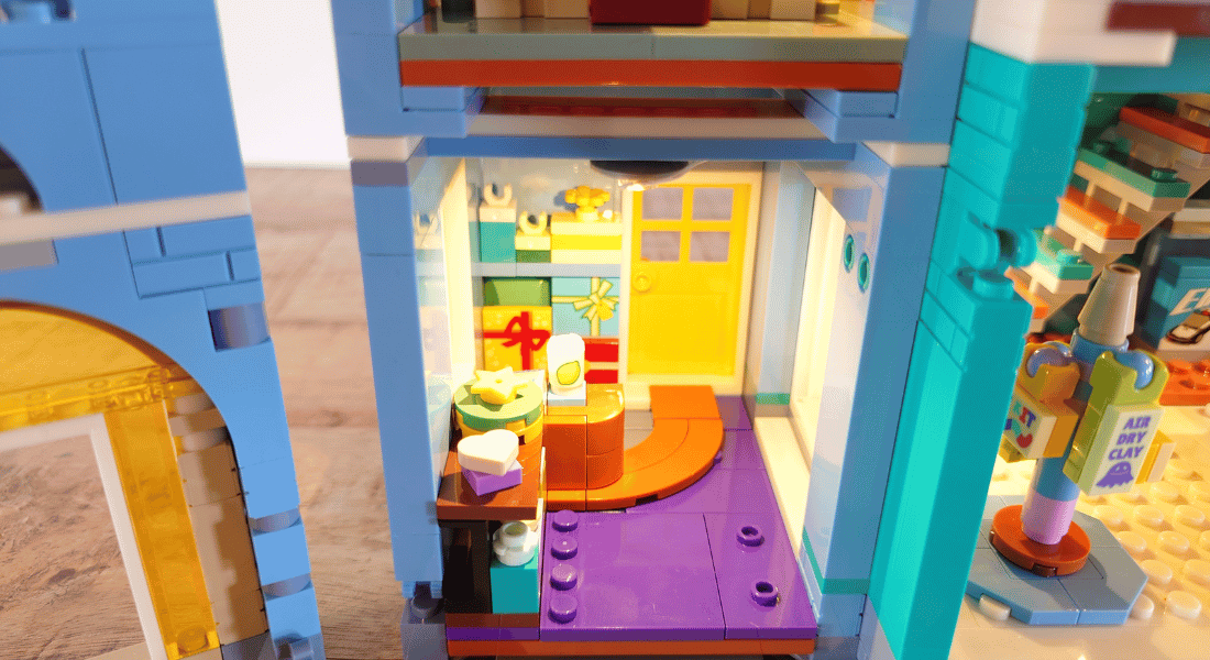Tijdens de bouw wissel je steeds tussen de het opbouwen van de etages van de winkel en diverse interieurmodules. Dit maakt het proces leuk, gevarieerd en onderhoudend. Zonder deze aanpak zou de bouw waarschijnlijk minder enerverend zijn, want in de basis worden de verdiepingen op een vergelijkbare manier opgebouwd. Begrijp me niet verkeerd: er is zeker afwisseling, maar het fundament blijft hetzelfde. Elke etage bevat een trap naar de volgende verdieping en biedt een grote variatie aan bouwbare speelgoedmodellen, Lumibricks-sets in microformaat, etalages en werkruimtes. Deze details zorgen voor extra dynamiek tijdens het bouwen. Zodra een verdieping klaar is, schuif je eenvoudig een kleine en grote interieurmodule in het gebouw, waarna je doorgaat met de volgende etage.