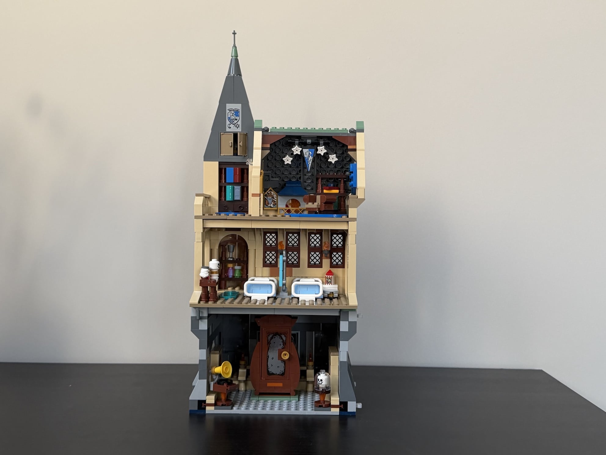 Het leuke van deze serie is dat je bepaalde onderdelen ook uit het kasteel kunt nemen en er iets anders (uit eerdere sets) voor in de plaats kun zetten. Maar dat voordeel is ook meteen een nadeel. Er zijn door de uitbreidingen meer lokalen en andere ruimtes beschikbaar dan plekken om ze te vullen. Dus je blijft altijd met een paar reserve lokalen zitten. Hopelijk wordt dat in de toekomst nog goedgemaakt. Daarnaast hoop ik dat in de toekomst ook op andere etages van het kasteel delen uitgenomen en ingezet kunnen worden. Maar goed, dit zijn details.