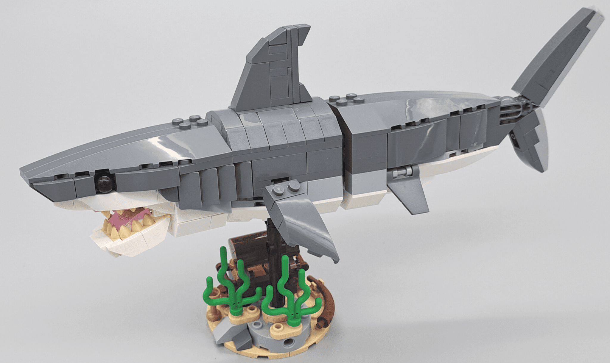 Het hoogtepunt en de focus van de set stel niet teleur. De haai is samengesteld met een mooie selectie aan onderdelen en komt hierdoor erg realistisch over. Om alle vormen te behalen worden een aantal leuke technieken bovengehaald. Een rij Cheese Slopes stellen de kieuwen voor, dat erg goed bedacht is.